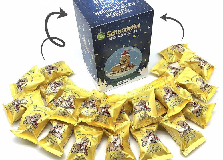Die Scherzkeks Adventsbox für die Weihnachtszeit. Diese Adventsbox enthält 24 glücklich machende Kekse, die mit humorvollen Fragen und Antworten gefüllt sind. Jeder Keks sorgt für eine Portion Spaß und gute Laune und macht das Warten auf Weihnachten zu einem unterhaltsamen Erlebnis. Ob Glückskekse lecker sind kann schnekenohnedenken dabei aber nicht sagen :-)